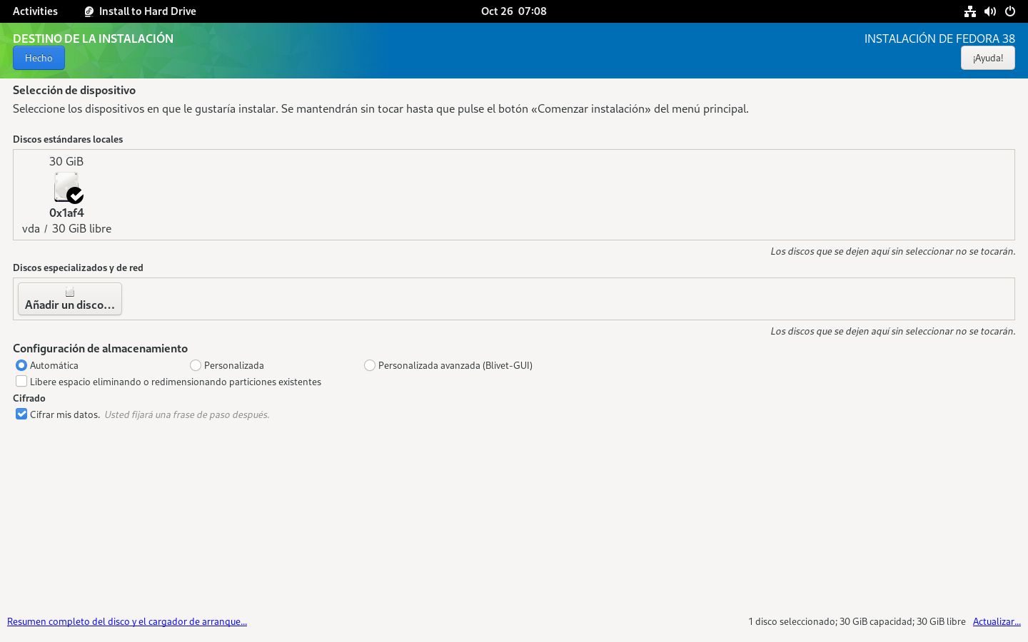 Si el usuario sigue el procedimiento indicado para habilitar el cifrado de disco en Fedora, notará que el sistema cifra el volumen Btrfs que lo sustenta con LUKS. Sin embargo, es importante destacar que las particiones de arranque, incluyendo la de EFI y el directorio /boot, permanecen sin cifrar y utilizan el formato EXT4.