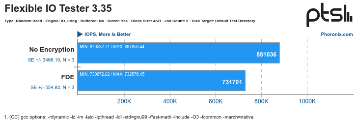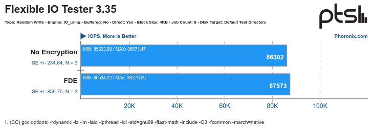 La inicial evaluación efectuada se llevó a cabo mediante el empleo de Flexible IO Tester. En esta evaluación se evidenció que el rendimiento al realizar lecturas aleatorias de 4K con cifrado de disco es un 83% menor en comparación con la misma operación sin cifrado de disco. Es importante destacar que se utiliza un SSD a través de la interfaz NVMe, por lo que en situaciones cotidianas, es poco probable que se perciba significativamente esta discrepancia.