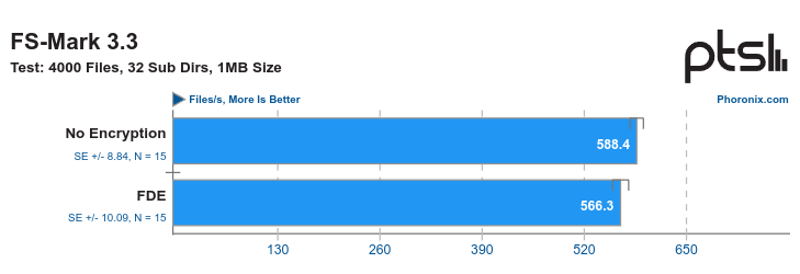Las pruebas posteriores reflejan un nivel de rendimiento bastante consistente, donde la instalación sin cifrado de disco presenta un ligero aumento en su desempeño. No obstante, esta diferencia es tan insignificante que resultaría difícil de percibir en condiciones normales de uso de la computadora. En el caso de FS-Mark 3.3, reiteramos que la instalación sin cifrado de disco sigue siendo la opción que muestra un mejor rendimiento.